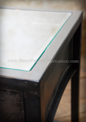 These twin end tables were a custom order recently completed for the owners of the file cabinet that was featured a few posts back. The features include tempered glass tops with a steel frame work and arched sheet metal sides. The sides have rolled bead work and hand hammered dimples. This pair of tables measure 15" square and stand 18" tall. Custom built sizes are always available, email me for a quote.